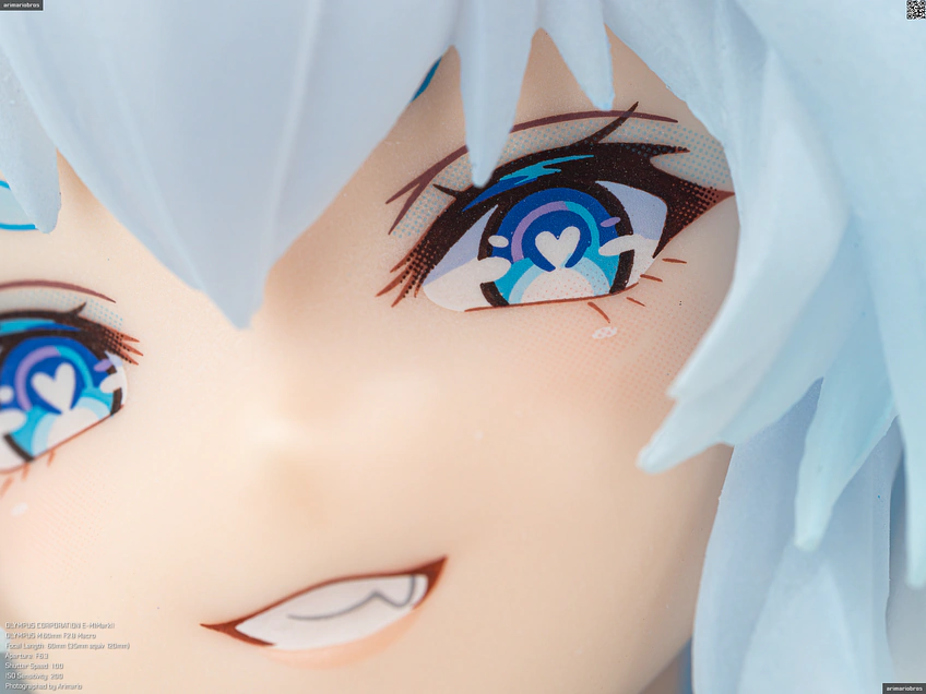 マクロ撮影してみると、アイプリは元絵に忠実なデザイン。瞳の中心のハートマーク、下部の白いハイライト、左右の横線形のハイライトと、オリジナルの要素はすべて踏襲しています。ただ、元絵に比べると、水平アングルで違和感がないよう視線が微調整されていますね。また、ニヤリとした口角がはっきり描かれているのも違和感の原因かもしれません。