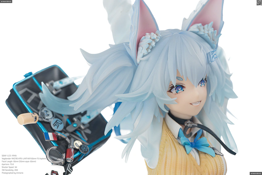 首元にはリボン結びにしたネクタイと、首輪をイメージしたと思わしきチョーカー。リボンがしっかりグラデーション塗装されているのが嬉しいほか、シャツの襟元も結構しっかり造形されていますね。バストは美少女系フィギュアとしてはかなり控えめ。その他、今風にデコった学生鞄を持っています。