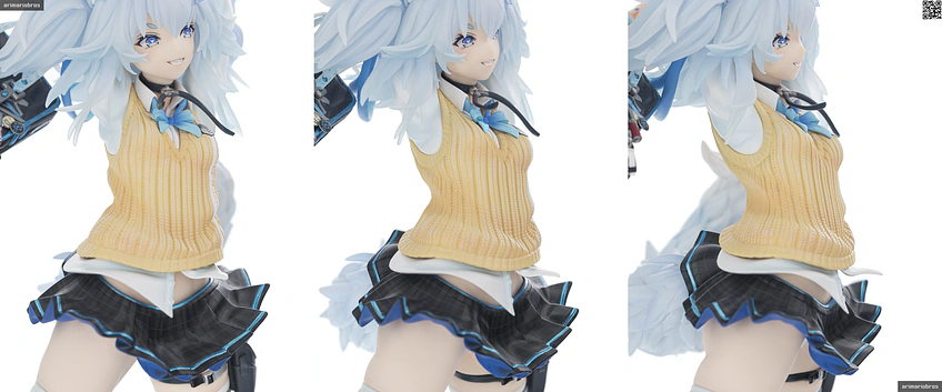 胴部はシンプルな制服スタイル。見どころはスクールセーターの質感でしょうか。細かいところまでニット生地を再現しており、遠目からであれば本物のセーターのように見える完成度です。ポージングにあわせた皺の表現もリアリティあってよいですね。