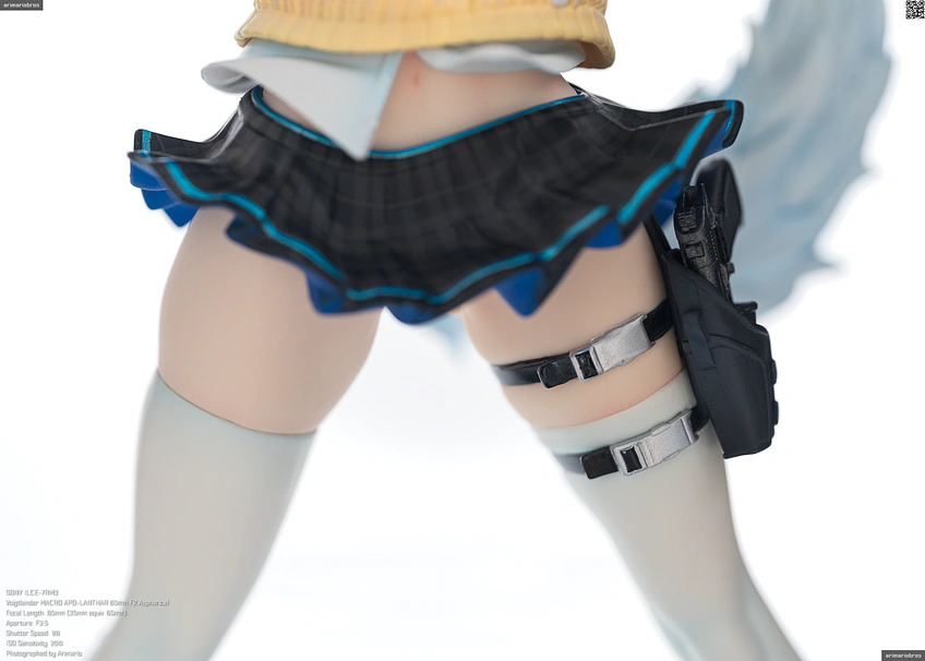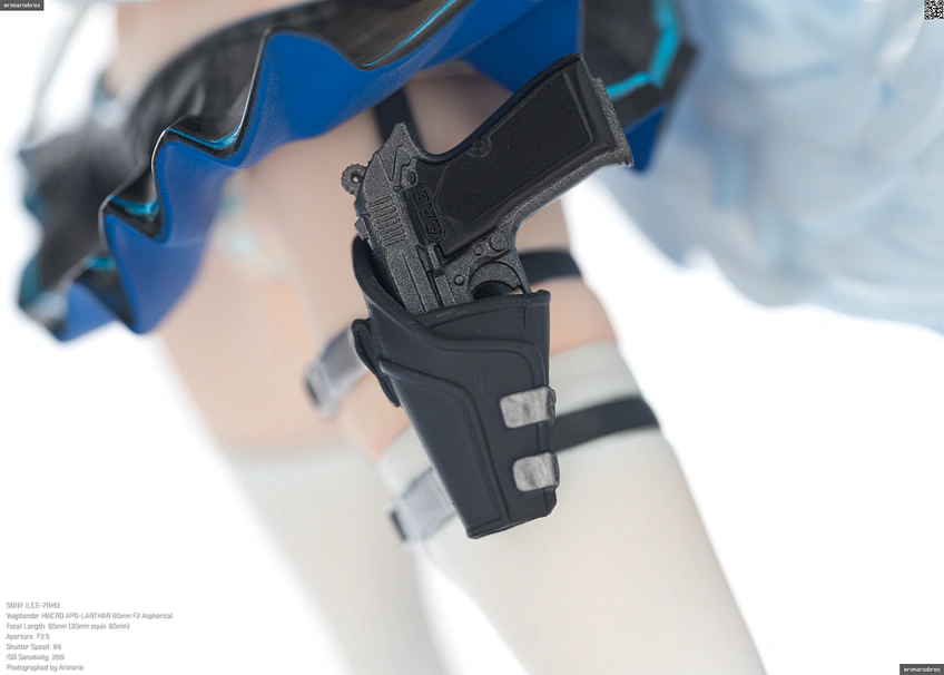 太ももには全体像の項で触れたホルスターを着用。ホルスターのベルト部分が太ももに食い込んでおり、ややフェティッシュな造形。わざわざ付属品として紹介するほどではないので、ついでに紹介しておくと、PA-15拳銃の質感はややチープです。トリガーや撃鉄の形なんかはわりと忠実に再現しているんですけどね。例えば実物で滑り止めのために施されているシボ加工なんかは省略されています。