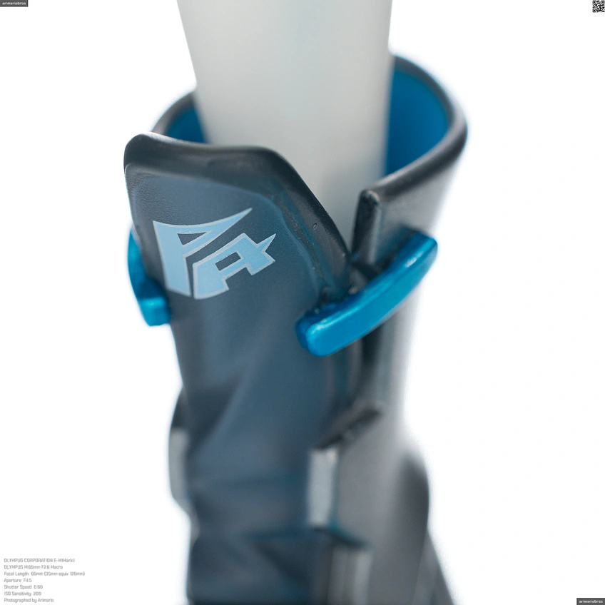 足元は重厚な金属製のブーツです。他のスーパーケモミミ学院衣装のキャラクターがローファーやスニーカーなどを着用している中で、異色のデザイン。スカートと同様にメタリックブルーでアクセントが入っているほか、脛あての部分には「PA」の文字があしらわれています。