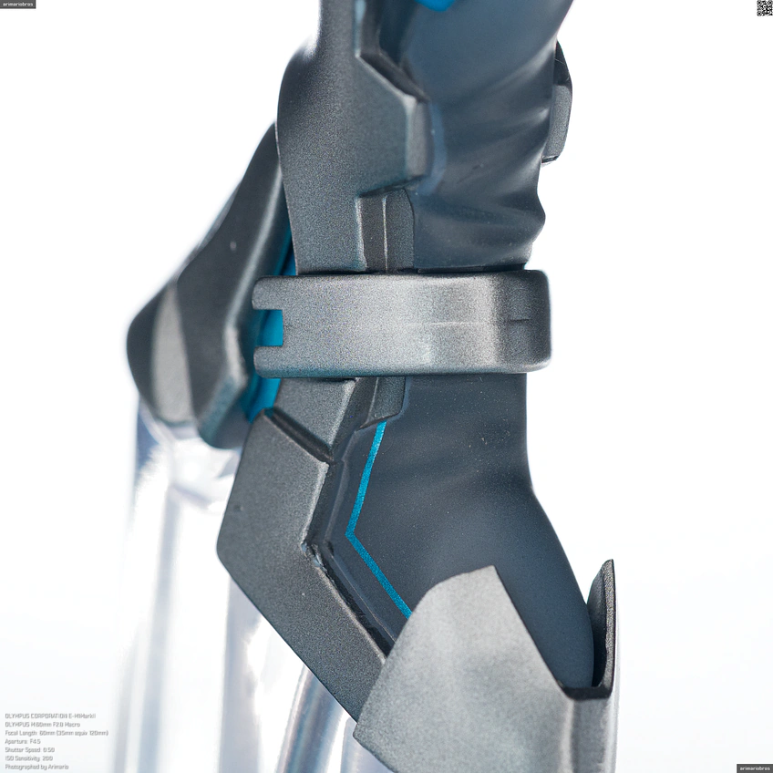 基本的にここも塗装は手堅い。ものすごく細かいですが、ブーツの内側までブルー塗装を入れていますね。外側と同じガンメタル色で塗られがちな個所ですが、塗り分けされているとポイント高いです。唯一、私の持っている個体はかかと部分のメタリックブルー塗装に若干のはみ出しがありますが、普通に飾っているぶんには全く見えない箇所だし、ガンメタル色のうえにメタリックブルーのはみ出しなのでそもそも目立ち辛く、目くじら立てるほどではないかな。