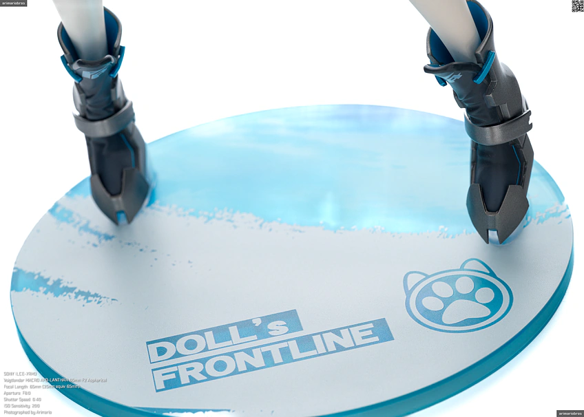 台座は青のクリアパーツ。衣装のカラーをイメージした青と白のカラーリングで、フィギュア全体の雰囲気によくマッチしています。アクセントとして、ドールズフロントラインの文字と、スーパーケモミミ学院を示す肉球のロゴが入っています。なお、重箱の隅ですが「Doll’s Frontline」は綴り誤りで「Dolls’ Frontline」(ドールズは複数形) が正しいはず。