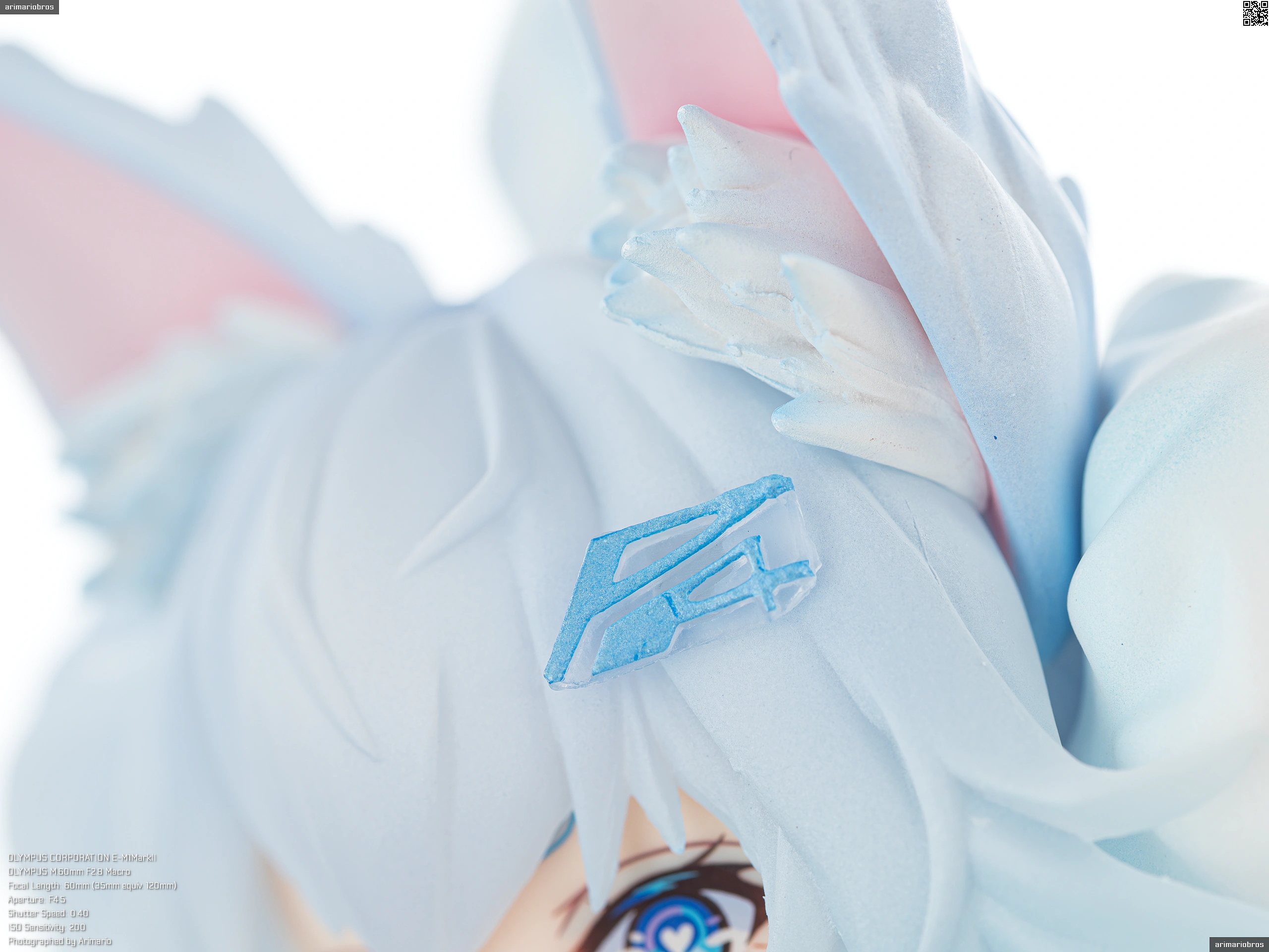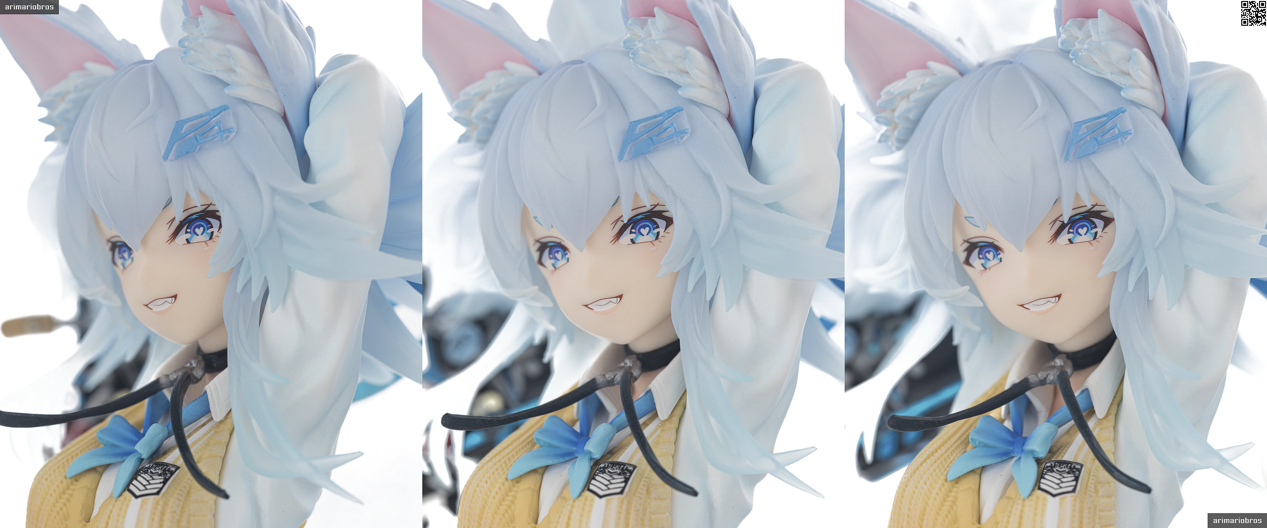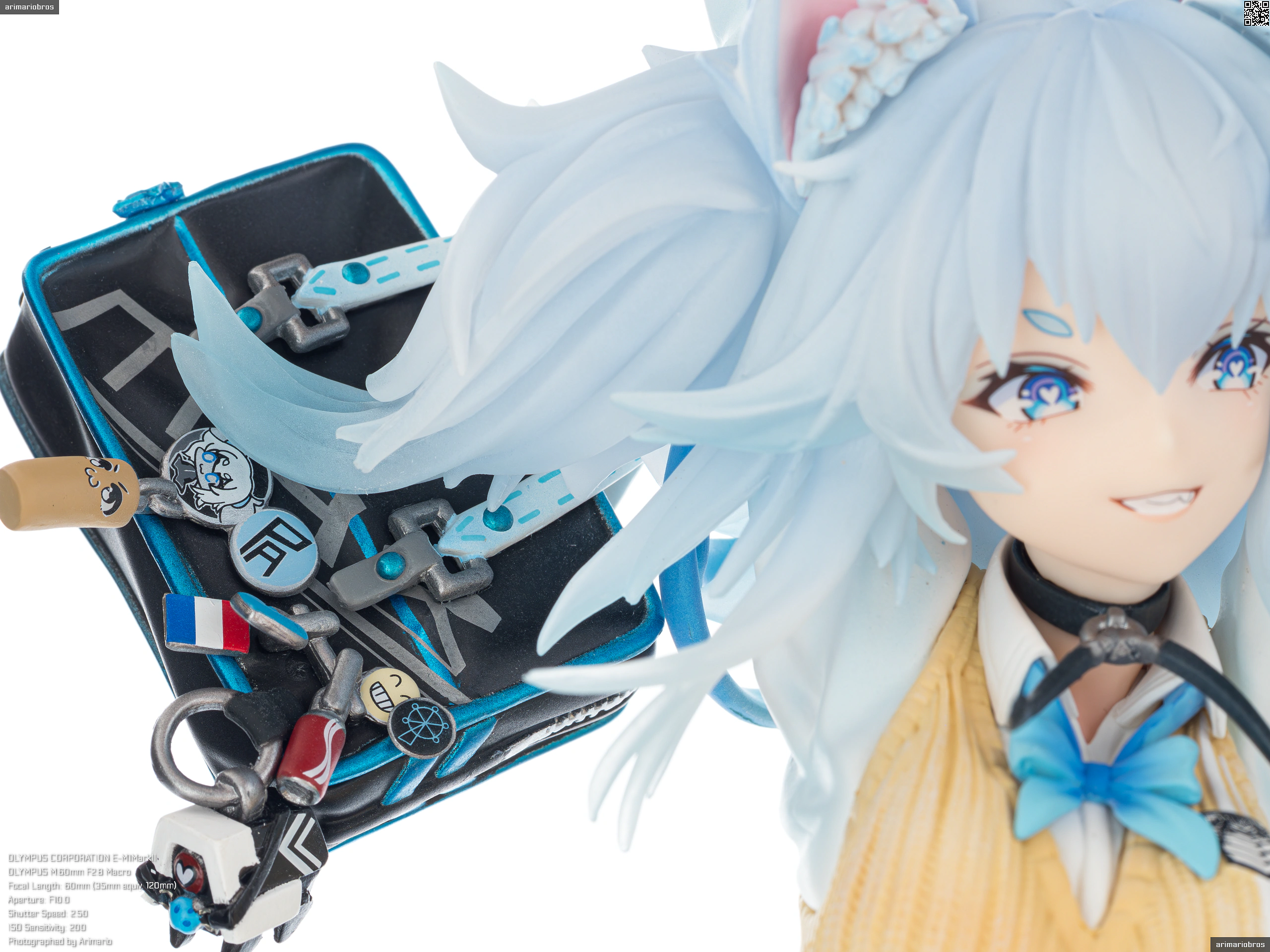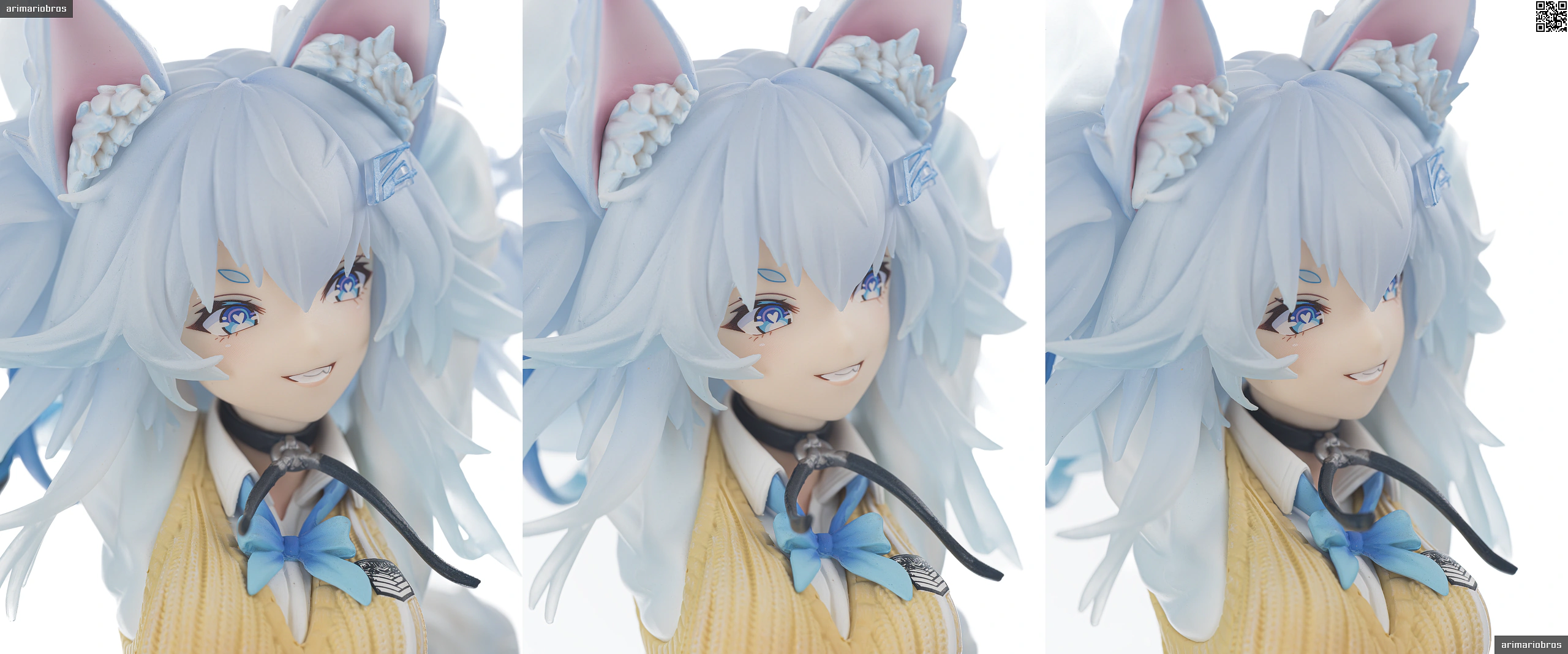 ポージングの再現度もそうですが、彩色見本からの変化がないところが嬉しい。強いていうなら、髪色は彩色見本より水色が強くなっているようにも感じますが、撮影時の色被りや現像時の設定でどうとでも転びそうな差です。ファット・カンパニーは比較的シンプルな造形のフィギュアを手掛けており派手さはありませんが、手堅いメーカーという印象がありますね。