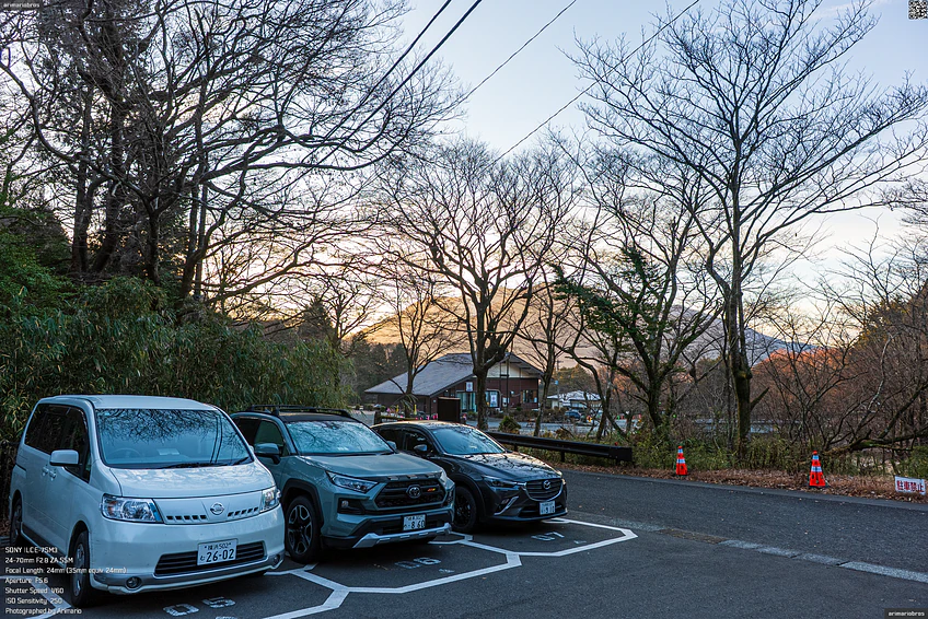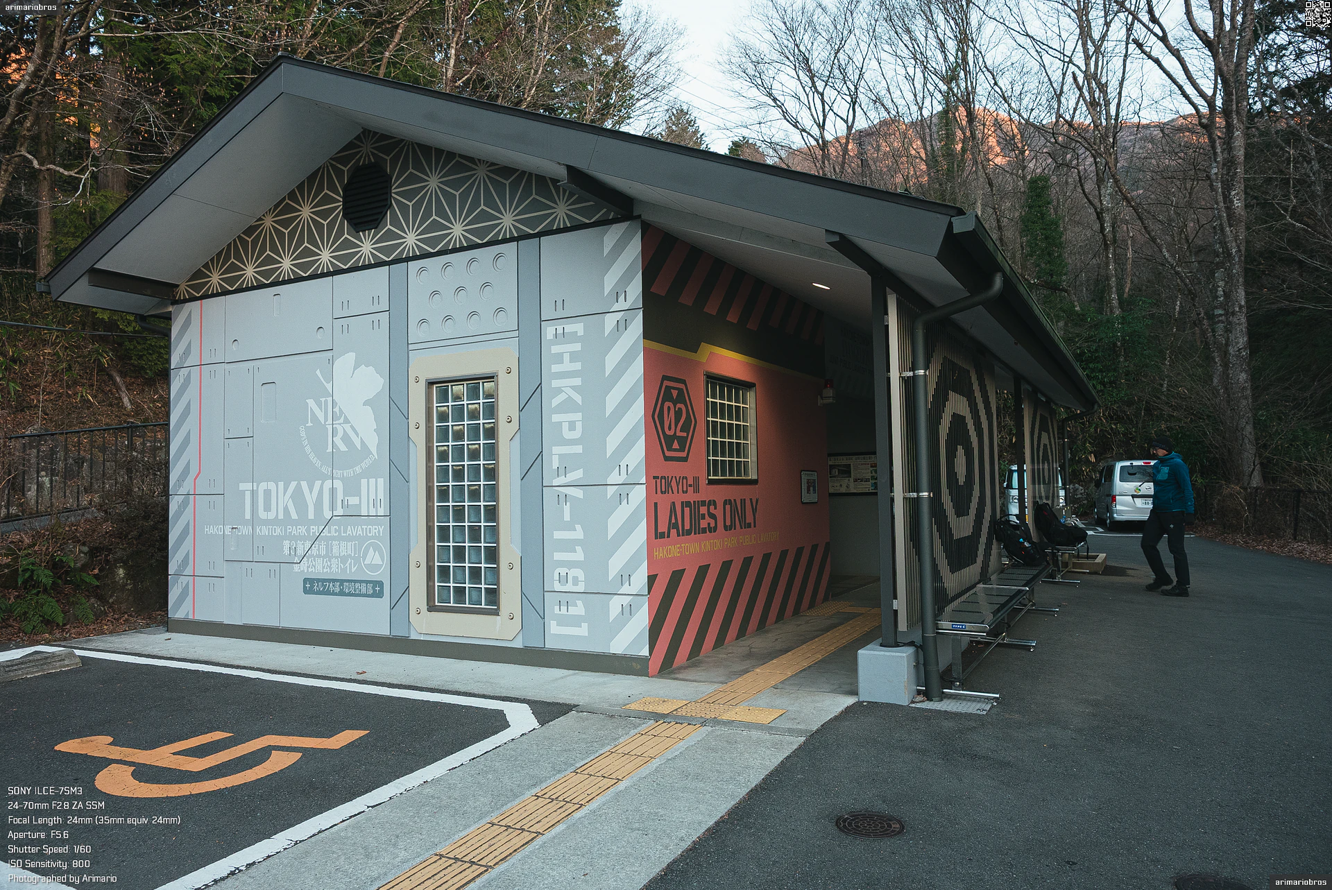 公時神社駐車場には6時30分頃に到着。大晦日だったので、そこまで混雑はしていないだろうと思っていましたが、普通車が駐車できるスペースはラスト1枠となっており、滑り込みセーフでした。ただ、先に書いたとおり近隣にハイカー向けの駐車場が存在するため、そこまで早く到着することに拘る必要はないと思います。ちなみにこの駐車場に併設されている公衆トイレは、アニメ『新世紀エヴァンゲリオン』の舞台が箱根をモデルとしていることから、同作品とのコラボデザイン。アニメファンであれば必見ですね。
