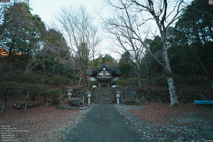 金時山への登山口は駐車場すぐ脇にあり、まずは公時神社への参道を歩いていきます。社務所で鶏を飼育しているようで、夜明けの時間帯ということもあってかコケコッコーと鳴き声が盛んに響いていました。