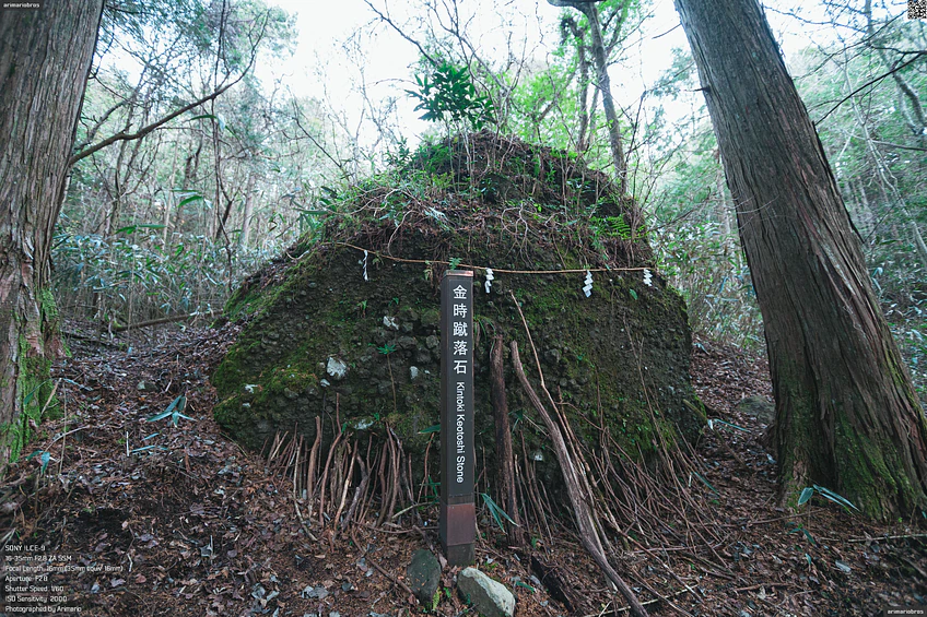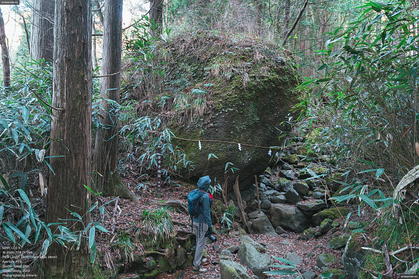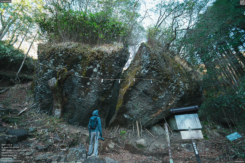 公時神社からはなだらかな登り。途中に金太郎伝説に関係する「手毬石」や「蹴落石」そして「金時宿り石」などの巨岩があるほか、公時神社の奥の院があります。特に、宿り石は5-6メートルあろうかという巨岩が真ん中でパックリと割れており、なかなか見ごたえがあります。割れたのは1931年の冬と意外に最近で、厳寒が理由ではないかとのこと。