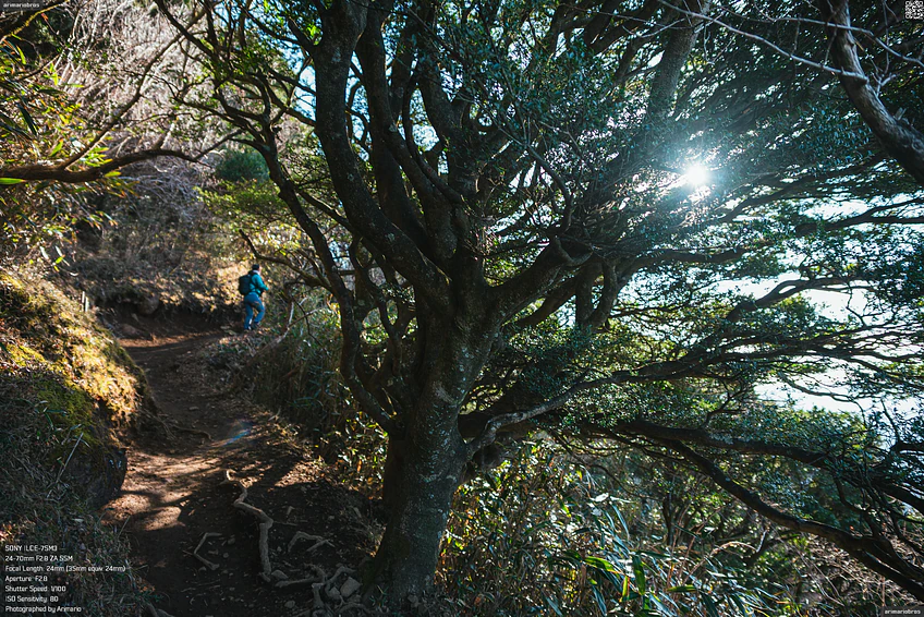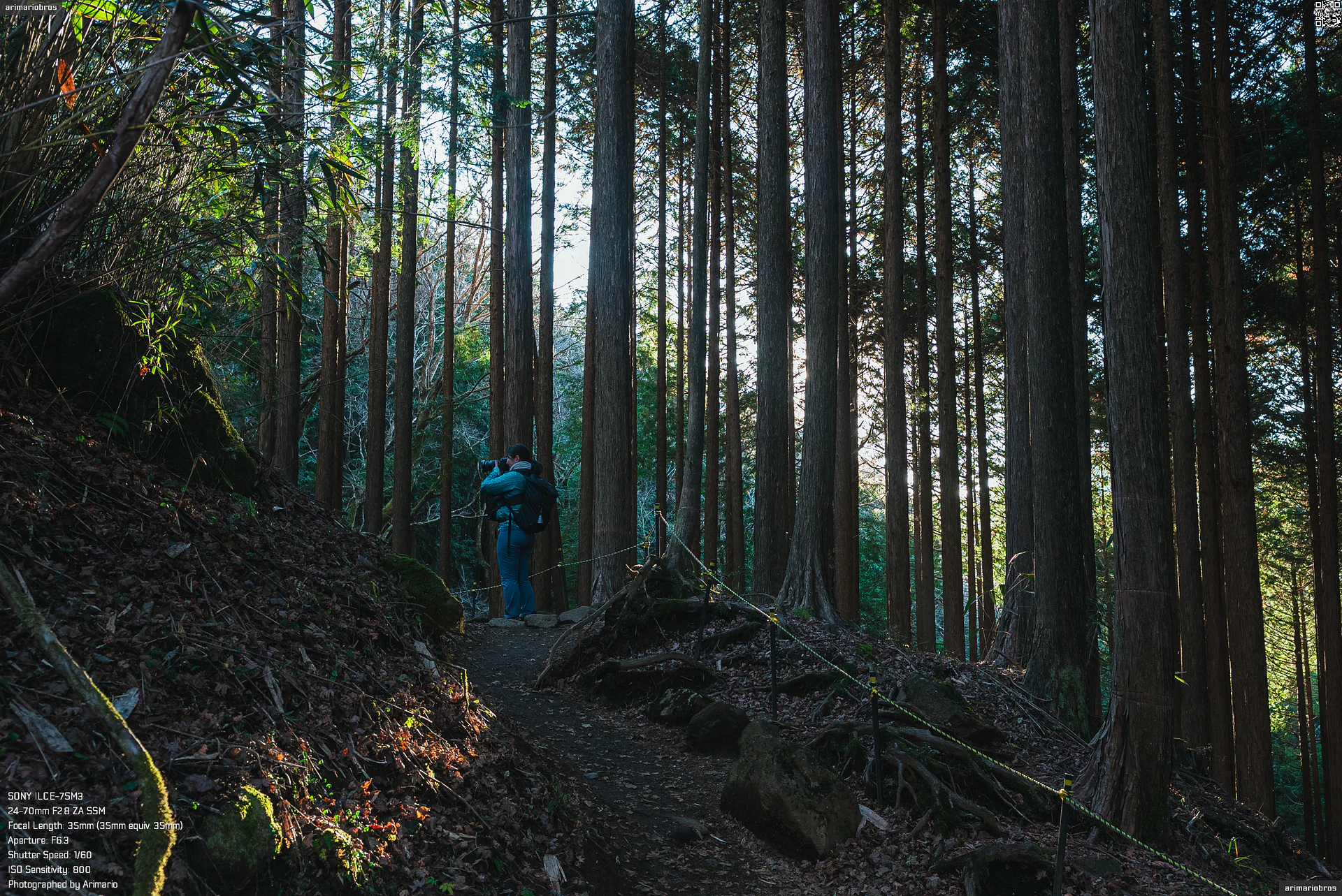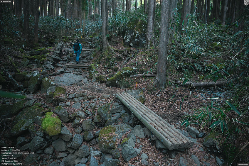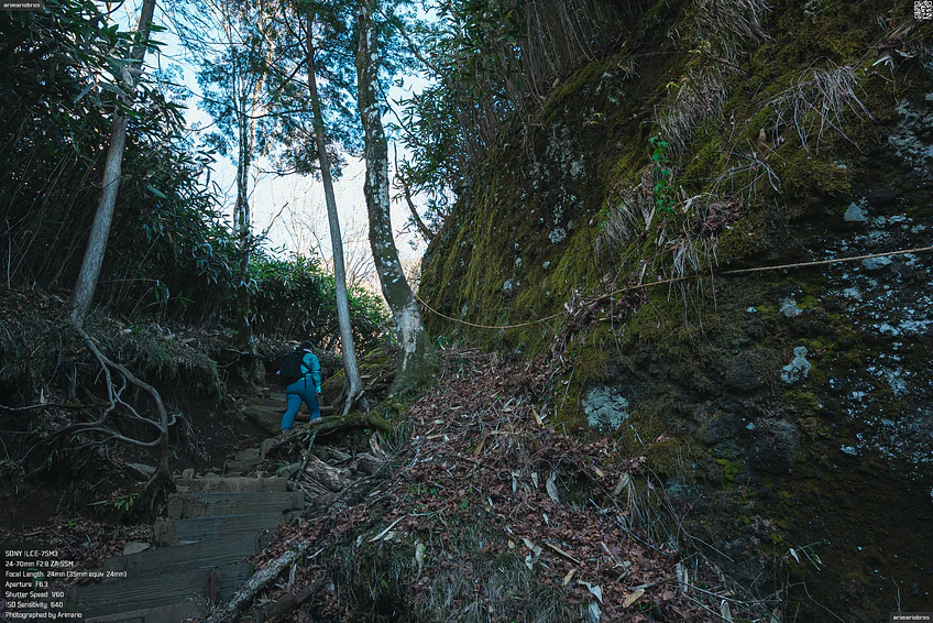 宿り石くらいまでは、おそらくハイカーではない観光客がやってくることを想定しているのだと思いますが、石ころすら落ちていないのでは? というレベルでよく整備されています。歩きやすさでいうと観光地である高尾山あたりと同格でしょう。ただし途中で一カ所、車道 (神奈川県道731号矢倉沢仙石原線、はこね金太郎ライン) を横断する必要があるため注意が必要。