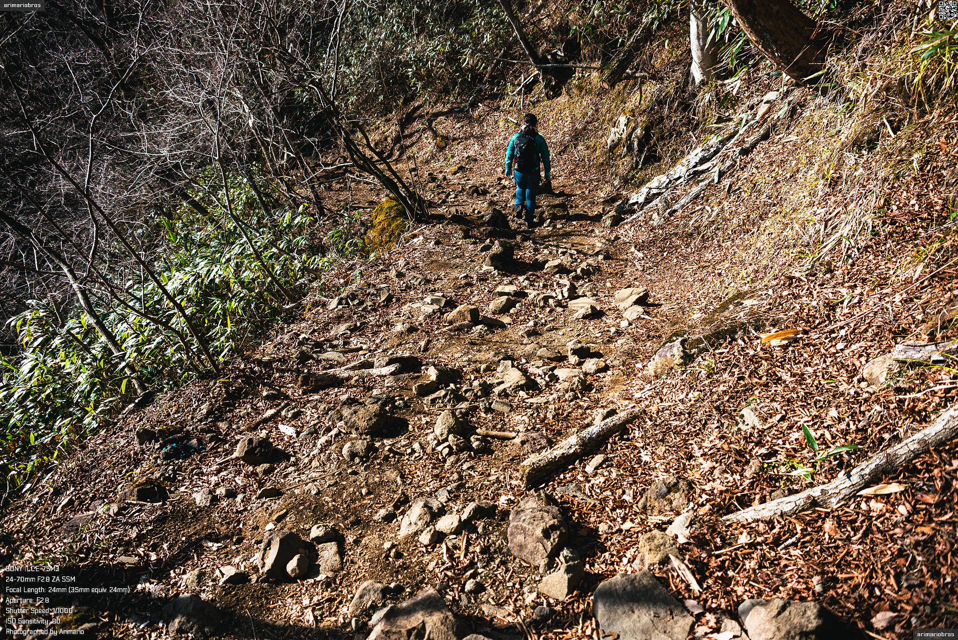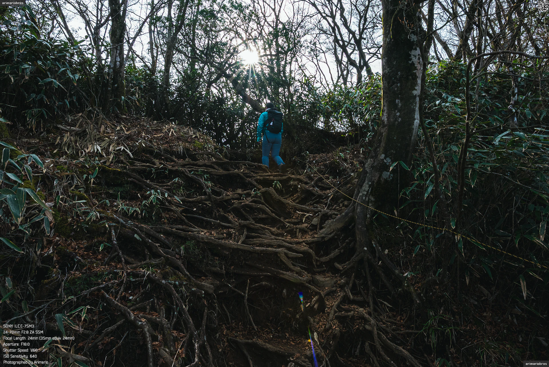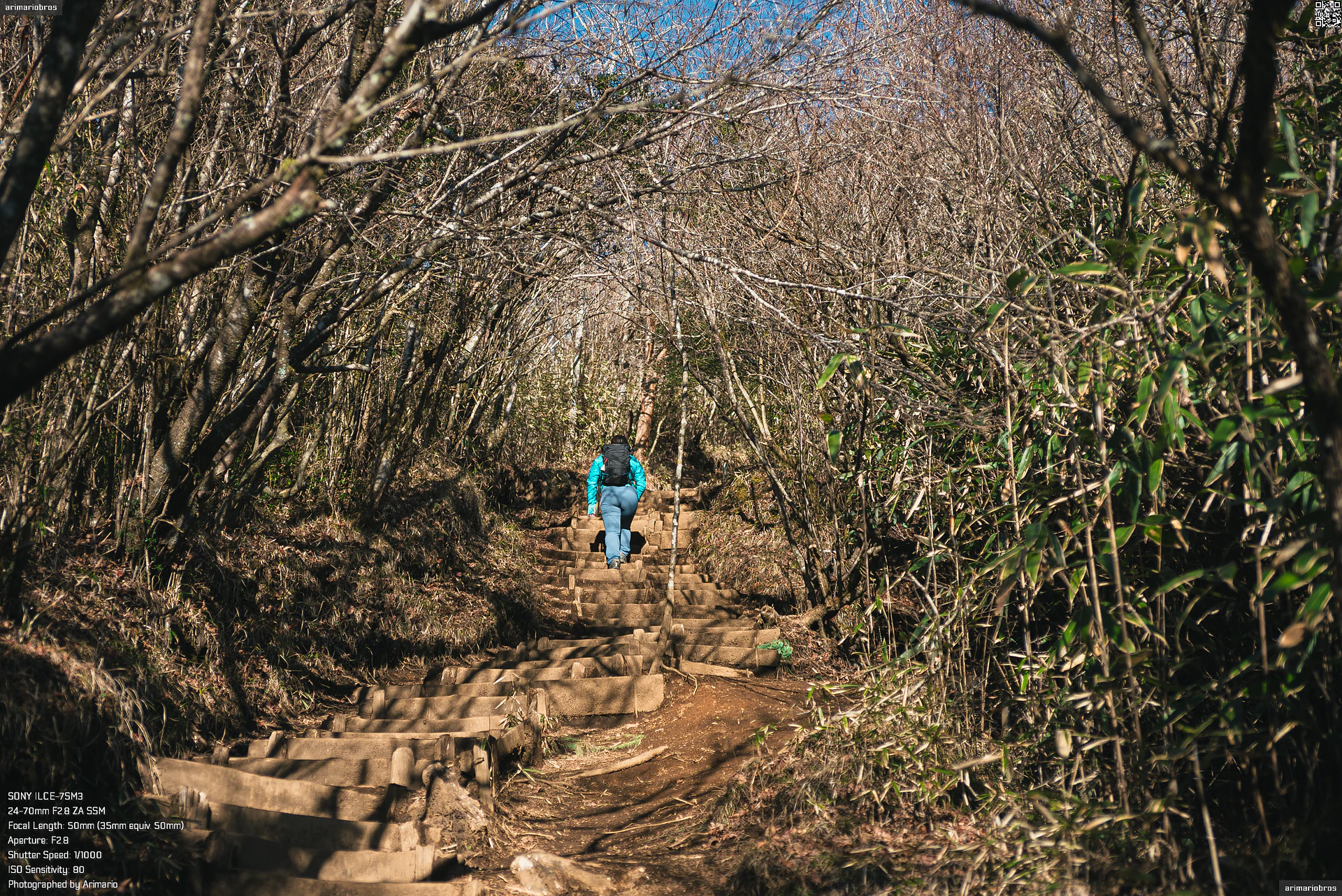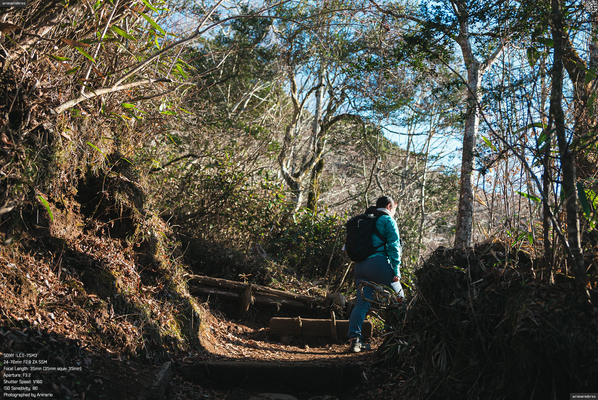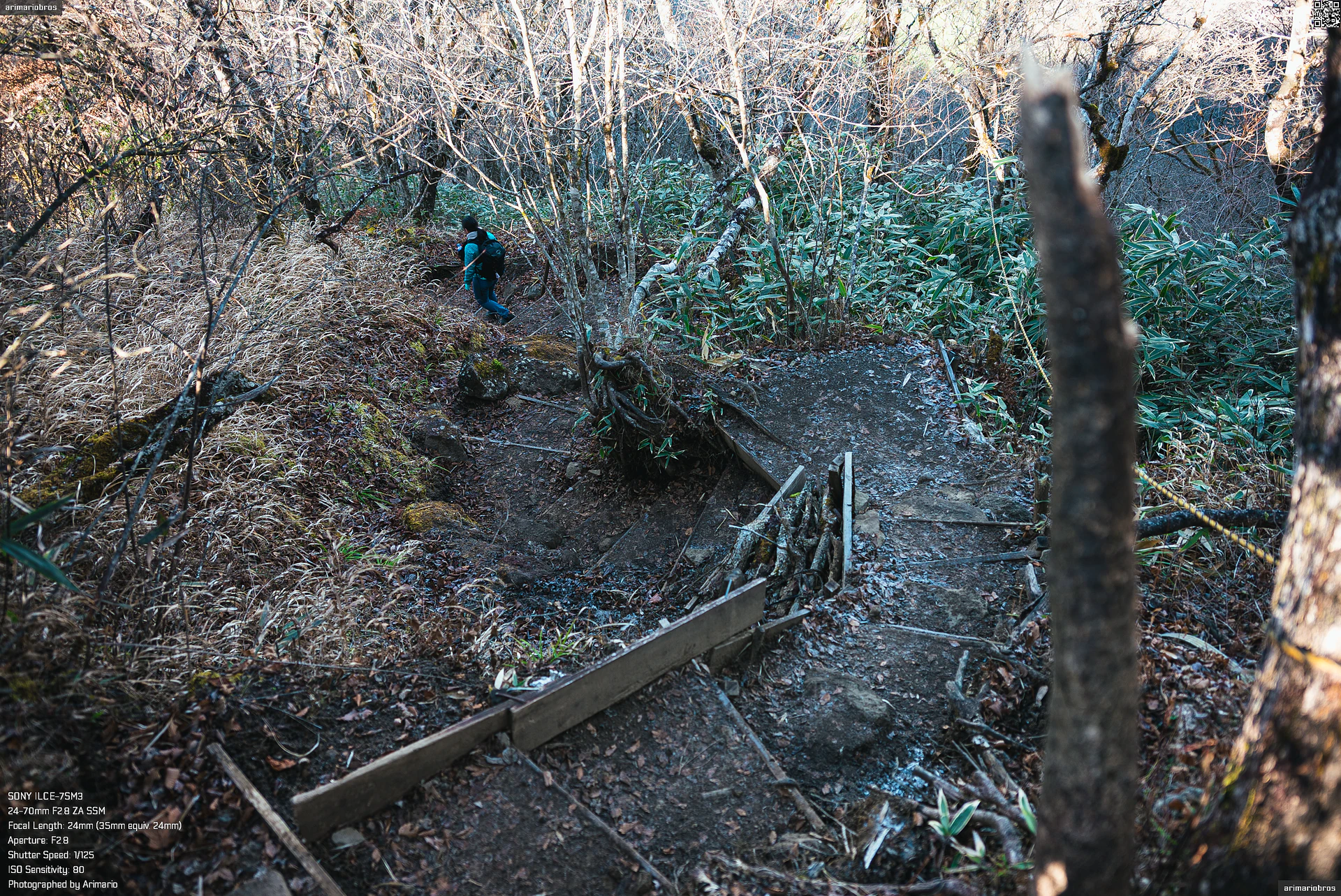 金時山からは、乙女峠へ向かうコースを下ります。乙女峠方面は、公時神社と比べると山頂直下がやや険しいですね。よく整備されているのは変わりませんが、狭い階段や段差の大きい岩場なども出てきますので、登山初心者が通過する際には少し注意したほうがよいかもしれません。