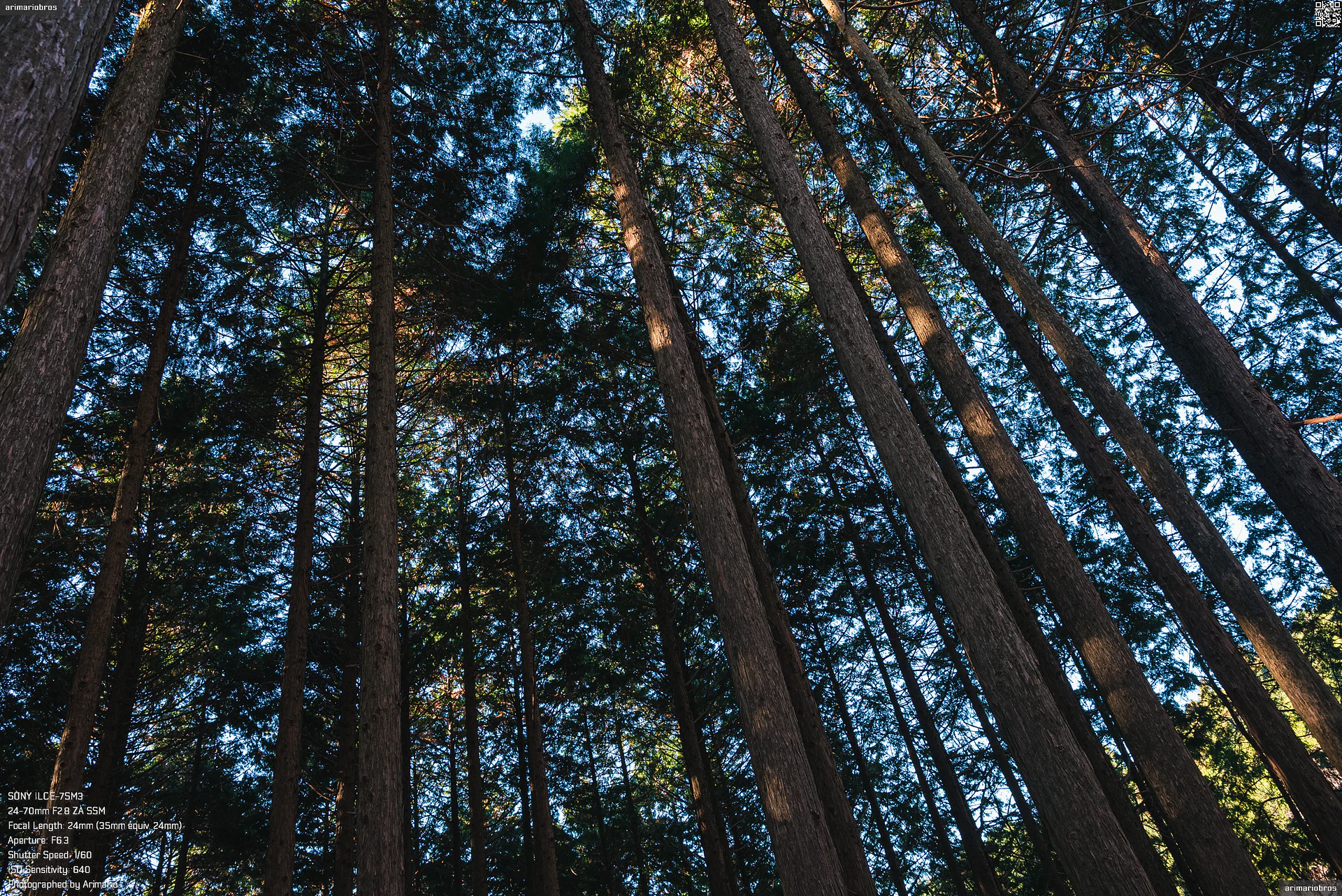 宿り石を過ぎると、若干ゴツゴツした路面も出てきますが、やはり歩きやすさは変わらず。徐々に高度が上がってくると、杉の人工林を抜けて、徐々に開放感が出てきます。場所によっては木々の合間から芦ノ湖まで続く箱根の街並みや箱根外輪の山々を望むことができることも。木々が途切れて青空が見えたら、間もなくジャンクション地点です。