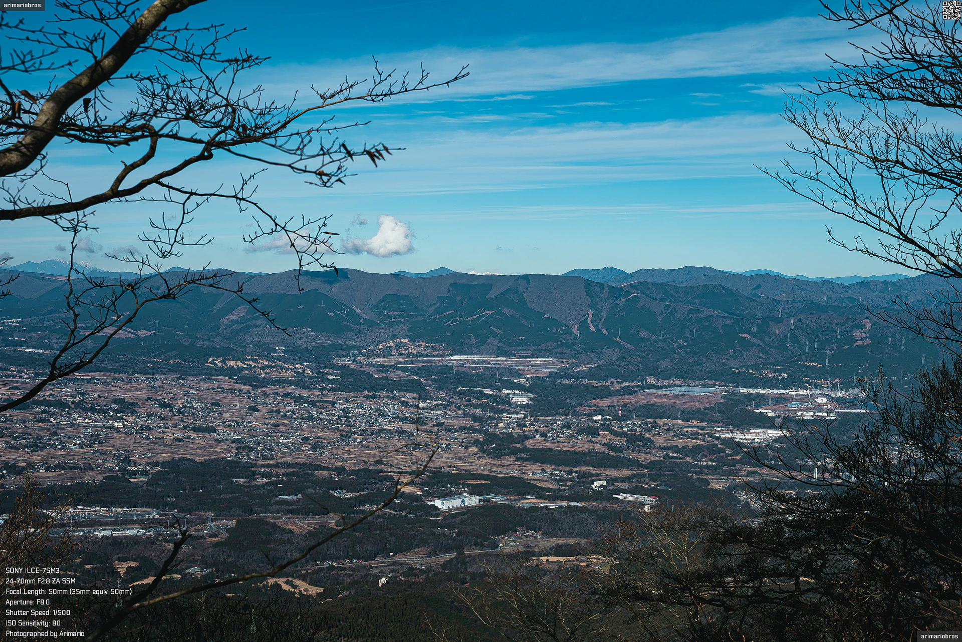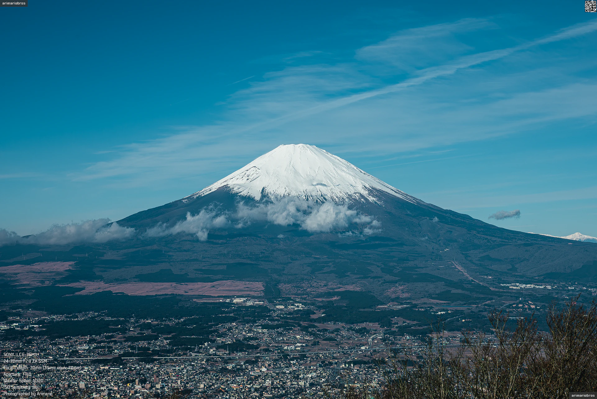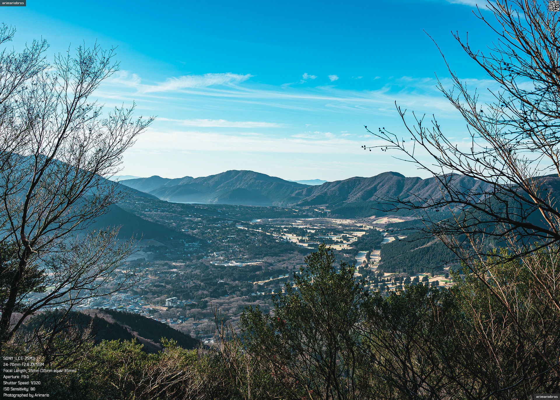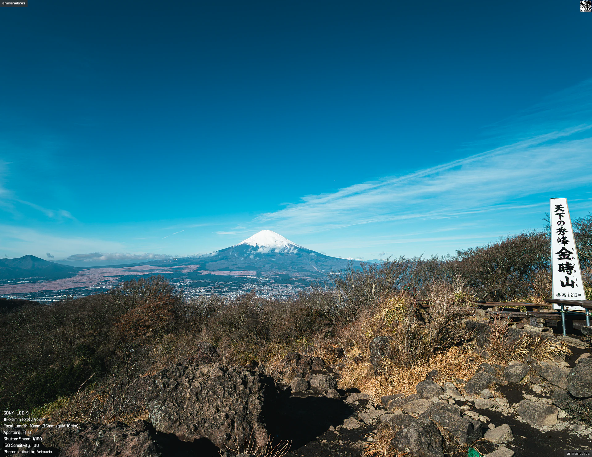 金時山の山頂は標高わずか1,212メートルしかありませんが、溶岩地帯ということと強風地帯であるということからか、植生が薄く見晴らしがとても優れています。なんといっても最大の見どころは御殿場の街並みを挟んでドーンと鎮座する富士山ですね。よくよくみると、富士山の右手には南アルプスの一部と、南八ヶ岳の山並みも顔を覗かせています。また、南側には箱根の街並みを挟んで、やはり活火山である箱根の最高峰、神山 (標高1,438メートル) を望むこともできます。