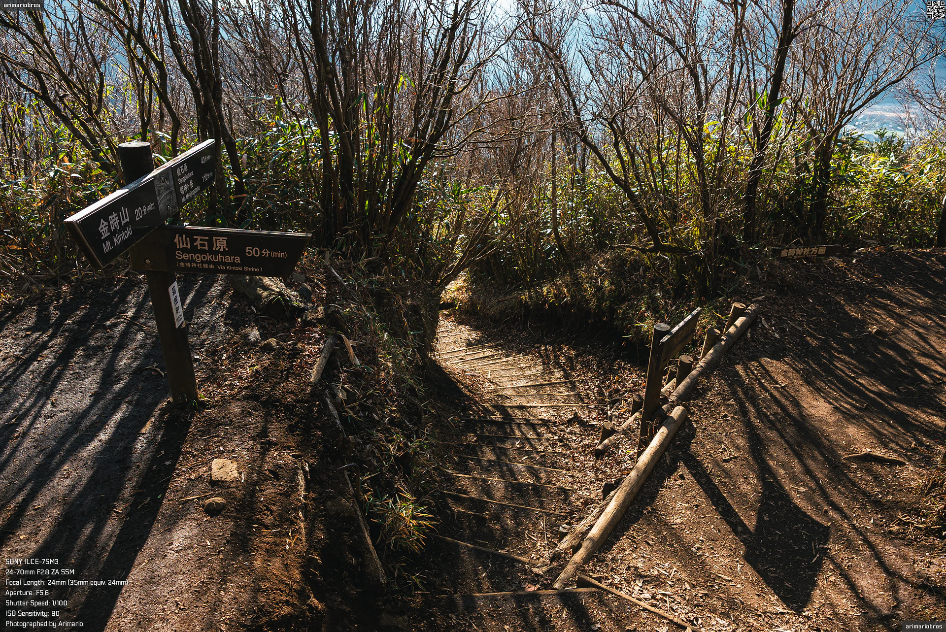 ジャンクション地点では、金時山登山口から登ってくる登山コースと合流します。これは金時登山口バス停から仙石原の別荘地を抜けて、大倉沢峠を経由して登ってくるというコース。公時神社よりも仙石原バス停に近い場所に登山口があるため、公共交通機関でアクセスするハイカーはよく利用しているんじゃないでしょうか。